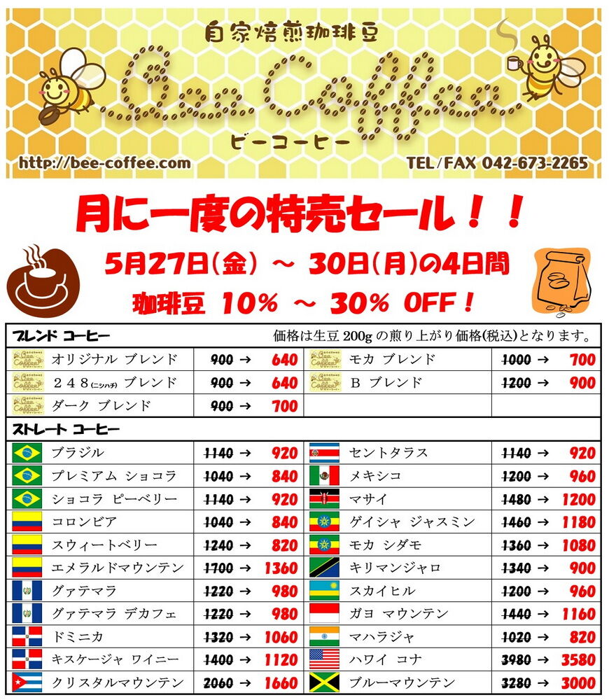 セール期間中、ブレンドのコーヒー豆は、焙煎した豆を少しご用意していますが、