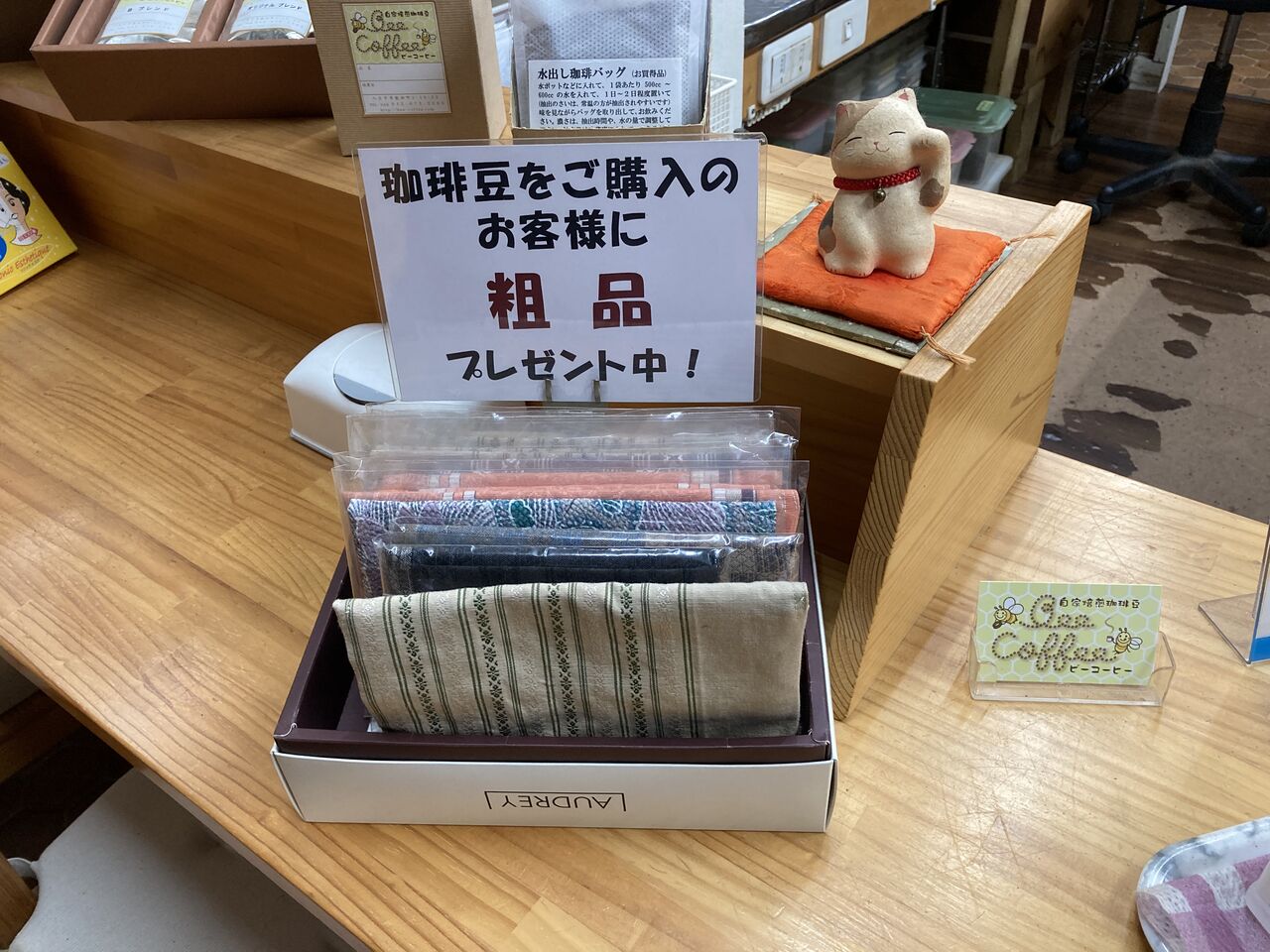 只今、珈琲豆をお買い上げの方に、粗品をプレゼント中